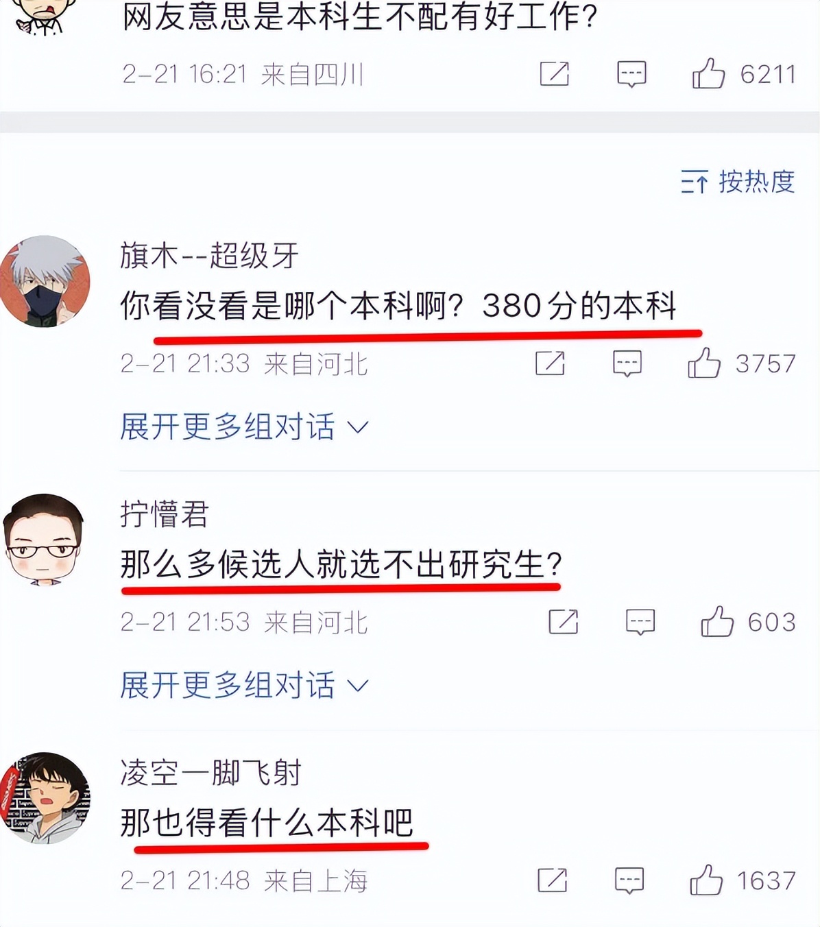 我不信,那么多好学校的研究生里面,找不出比那个3个水本更好的。其实看评论区,显而易见,大多数网友们也不信。