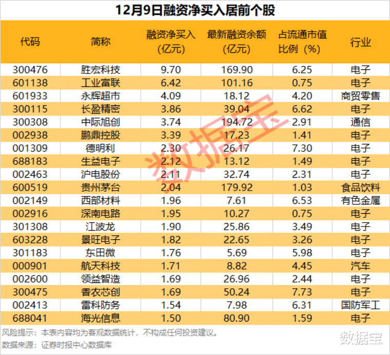 具体到个股,12月9日获融资净买入千万元以上的有537只,其中42只融资净买入额超1亿元。胜宏科技融资净买入额居首,当日净买入9.70亿元;其次是工业富联、永辉超市,融资净买入金额分别为6.42亿元、4.09亿元;融资净买入金额居前的还有长盈精密、中际旭创、鹏鼎控股等。