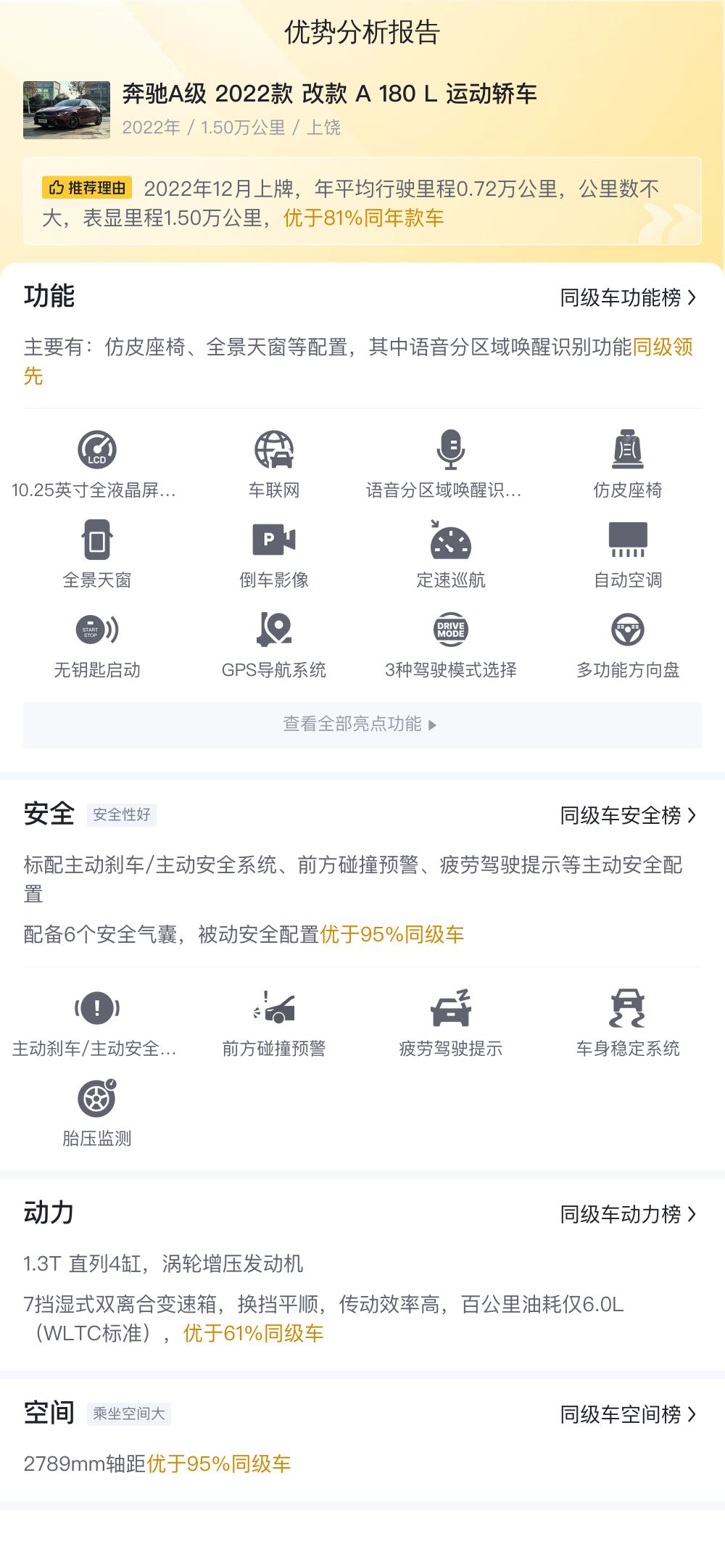 综上所述,奔驰A级 2022款 改款 A 180 L 运动轿车在配置、安全、动力、内饰、市场行情等方面均表现出一定的竞争力,作为一款二手车,也是不少消费者在选购入门级豪华轿车时的重要选择之一。需要注意的是,该车目前没有提供第三方检测报告,具体的车况信息,还需要结合车辆实际情况进行综合参考。