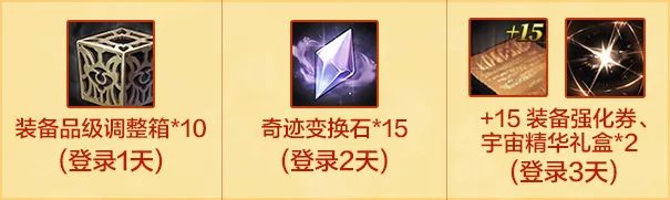 累计登录 3 天就能领取 + 15 装备强化券(账号绑定)*1、宇宙精华礼盒(账号绑定)*2;累计登录 2 天就能领取奇迹变换石(账号绑定)*15;累计登录 1 天就能领取装备品级调整箱(账号绑定)*10。不得不说,如今的 + 15 强化券简直成了白菜价,加上之前送的,已经有 5 张了,足够勇士们把一套防具强化起来。