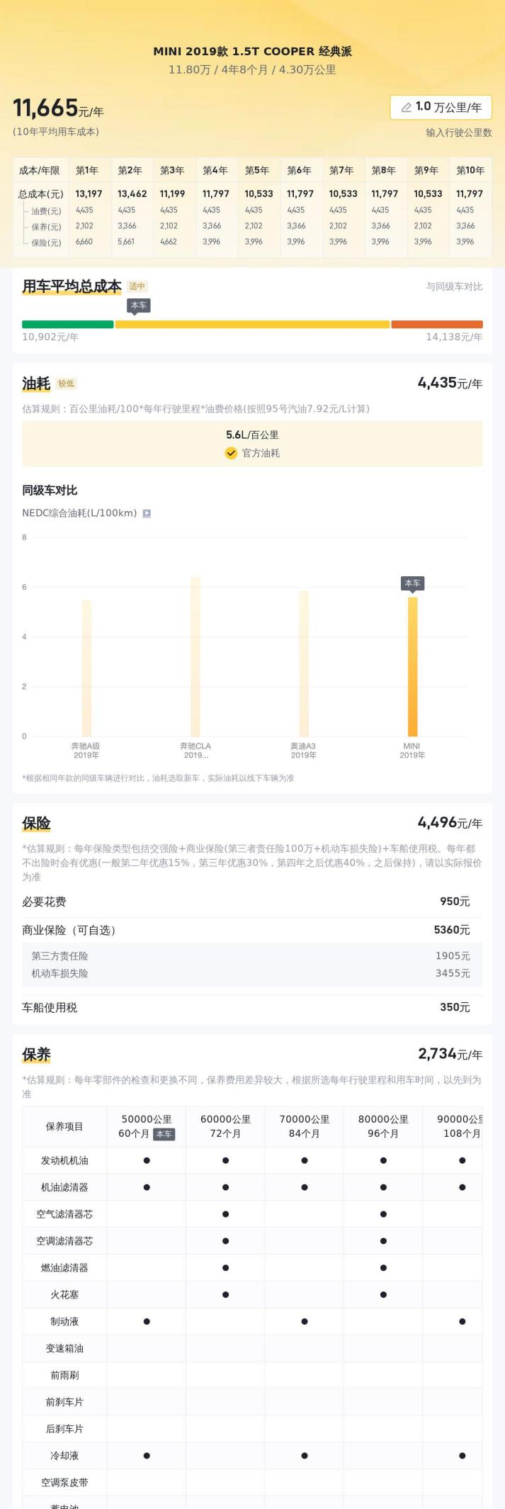 最后,我们再来看一些数据。根据懂车帝的数据,这辆二手MINI的市场价在11.67-14.12万之间,11.8万的报价处于合理区间。10年平均用车成本12466元/年,也不算太高。