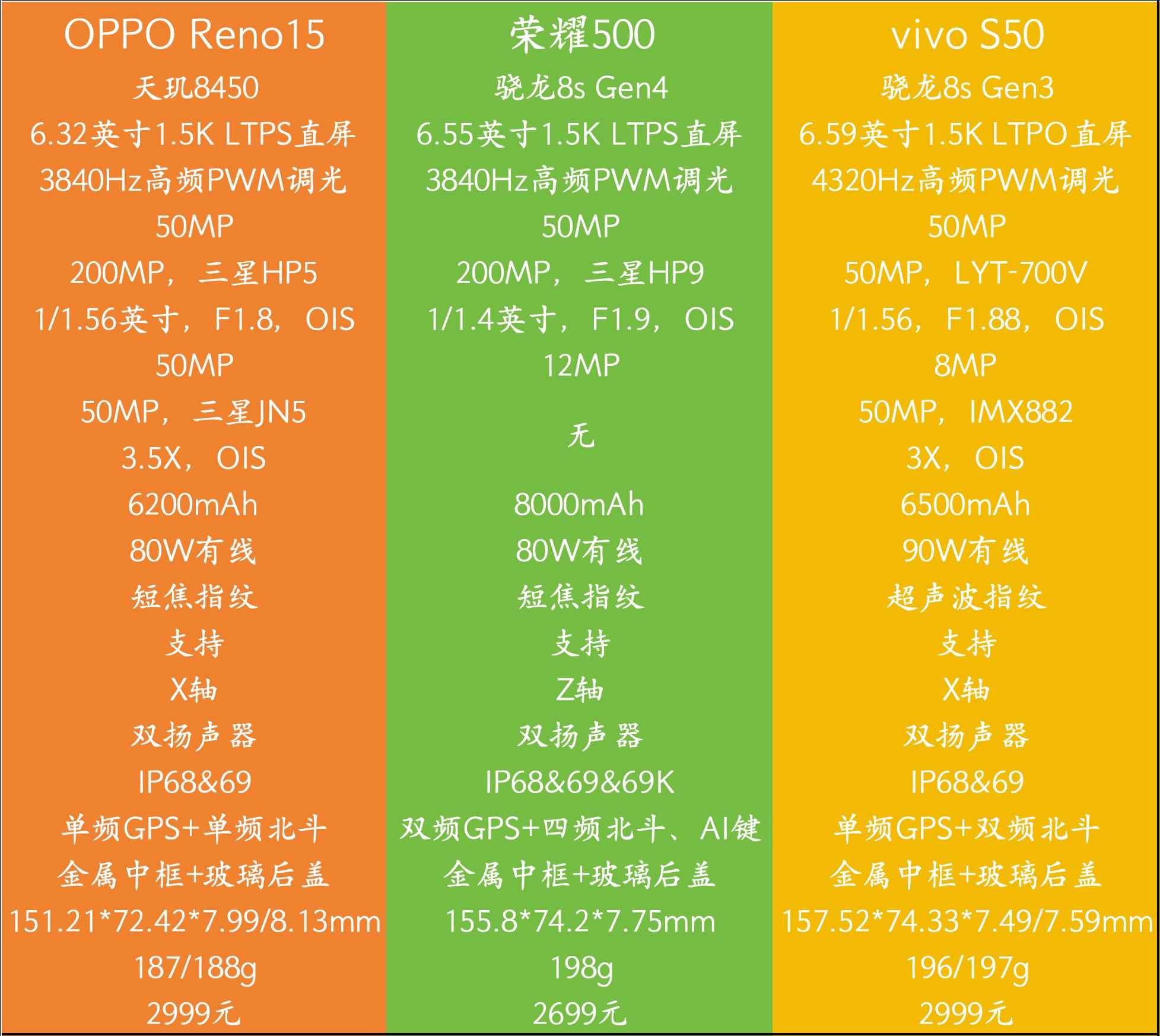性能部分:荣耀500>OPPO Reno15>vivo S50影像部分:OPPO Reno15≈vivo S50>荣耀500续航部分:荣耀500>OPPO Reno15≈vivo S50周边部分:vivo S50>荣耀500>OPPO Reno15价格部分:荣耀500>OPPO Reno15≈vivo S50简单而言,荣耀500感知最明显的优势是续航体验,vivo S50是超声波指纹解锁体验,OPPO Reno15是小屏手感体验。