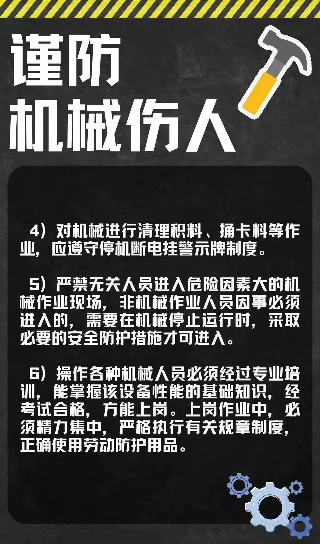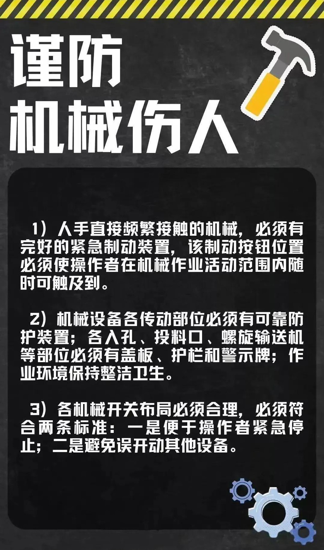 机械设备大大提高了生产力但时常发生的机械伤害事故也令人痛心每一起机械伤害事故的背后往往是人员安全意识的缺乏稍不注意,意外就可能发生机械伤害事故离我们并不遥远什么是机械伤害?机械伤害,是指机械设备运动(静止)时以及部件、工具、加工件直接与人体接触引起的挤压、碰撞、冲击、剪切、卷入、绞绕、甩出、切割、切断、刺扎等伤害,不包括车辆、起重机械引起的伤害。相关案例2024年贵州安顺西秀区一餐饮店一名21岁男子在清洗绞肉机时未进行断电不慎触碰机器开关将左手绞入其中导致4根手指瞬间被绞断消防员到场后成功将男子手指取出所幸医治及时男子4根断指已被接上