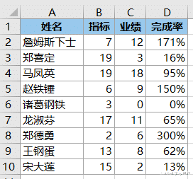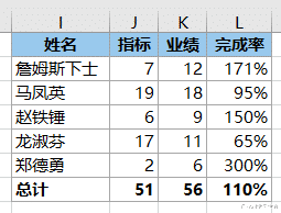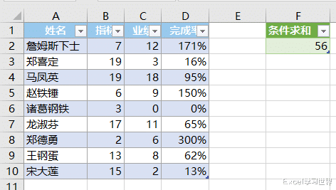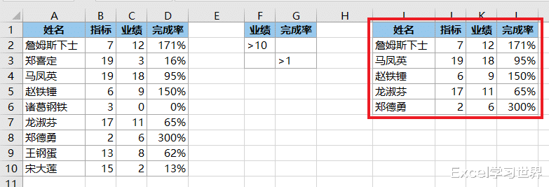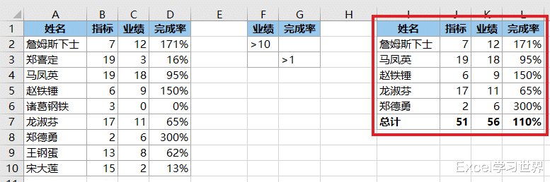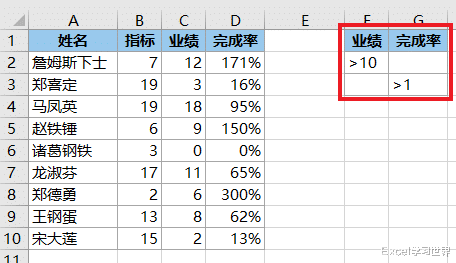 案例:对下图 1 中“业绩”>10 或“完成率”>100% 的所有业绩求和,效果如下图 2 所示。