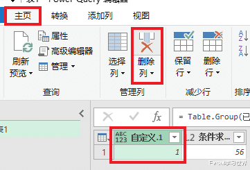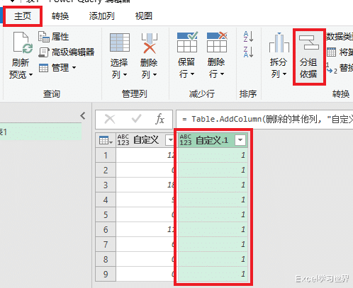 8. 选中“自定义.1”列 --> 选择任务栏的“主页”-->“分组依据”