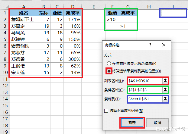 3. 在弹出的对话框中选择“将筛选结果复制到其他位置”--> 按以下方式设置 --> 点击“确定”: