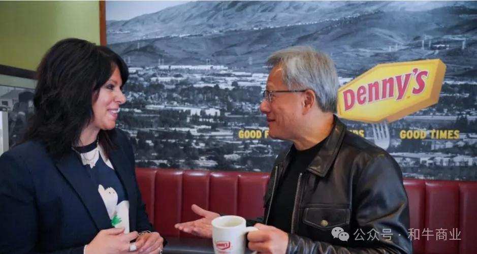2023年9月,丹尼餐厅(Denny’s)CEO Kelli Valade,与黄仁勋在加州圣何塞的丹尼餐厅举行牌匾揭幕仪式;1993年,黄仁勋在这里和合伙人成立了英伟达