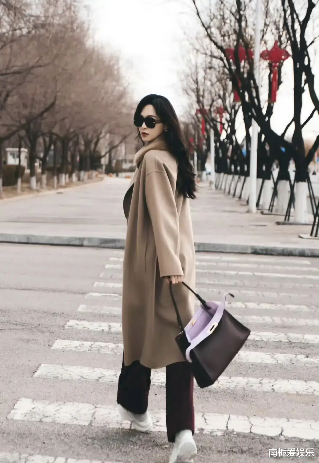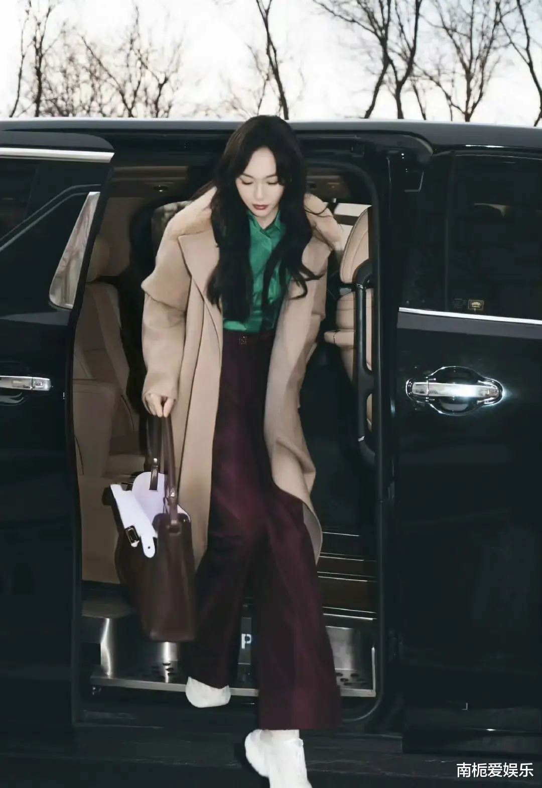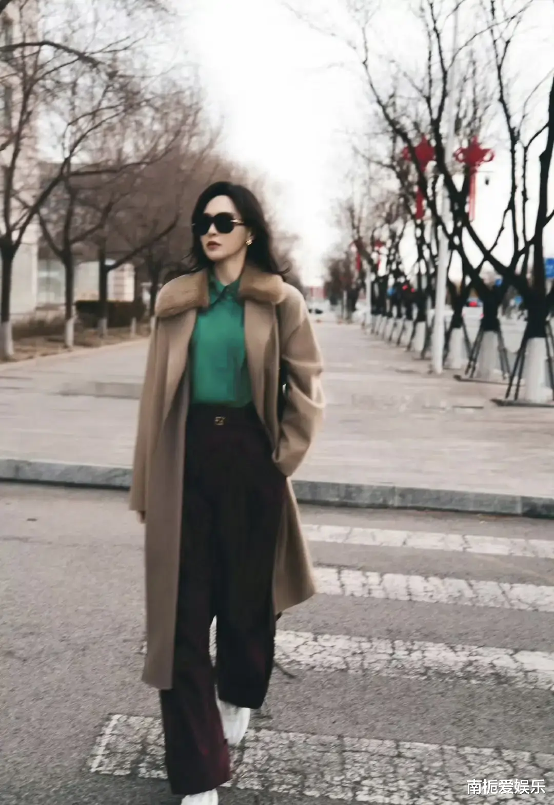 事件的起因,源于唐嫣走出轿车的瞬间:驼色羊绒大衣随意敞开,内搭墨绿色衬衫与棕色阔腿长裤,脚踩简约运动鞋,手拎无Logo Fendi手袋,复古墨镜架在鼻梁。没有夸张的廓形,没有堆砌的Logo,甚至连摆拍都带着“赶路”的松弛感——这种“克制的优雅”,恰好踩中了当下时尚圈推崇的“静奢风”脉搏。