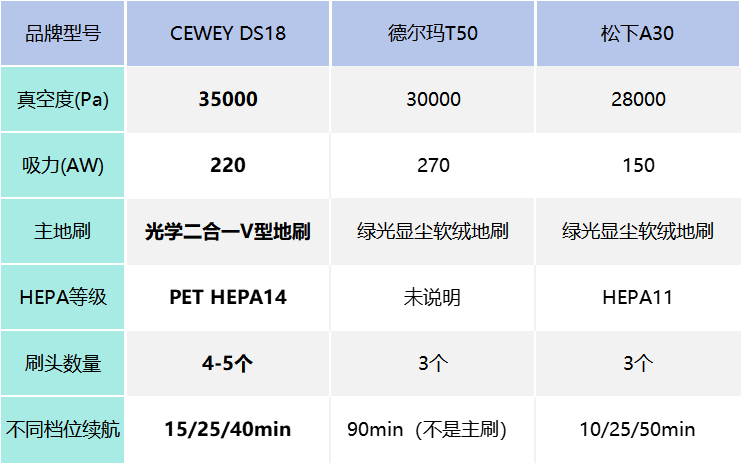 小结:以吸力数据为准,CEWEY DS18 为550W无刷电机,标称220AW、35000Pa,纸面数值到位,颗粒直推与纤维夹灰处理更从容。德尔玛T50 常见为稳健标注,峰值不刻意拔高;松下A30 的思路是偏向其他性能,吸力标注收得更紧。就参数维度而言,CEWEY DS18 在吸力与真空度两端更占先,整体余量更宽松。