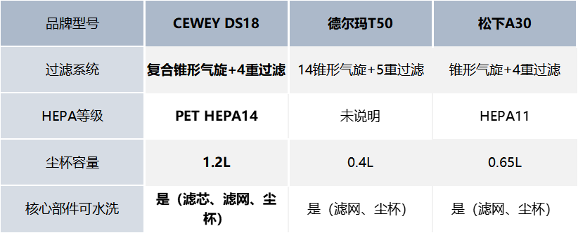 小结:从“过滤系统+尘杯”两点对照,CEWEY DS18 采用复合锥形气旋与四重过滤,主滤网为可水洗的 PET HEPA14,对细灰、螨虫与过敏源具备明确拦截路径;1.2L 尘杯在容量上更从容。德尔玛T50、松下A30 同属多层过滤,但滤网等级标注可能未写明或处于较低档位;且尘杯普遍小于 CEWEY DS18,实际使用中倒尘与清理频率更受影响。综合来看,CEWEY DS18 以明确的高等级 HEPA与较高可水洗覆盖度配合更大尘杯,带来更简便的日常维护与更友好的长期使用成本。