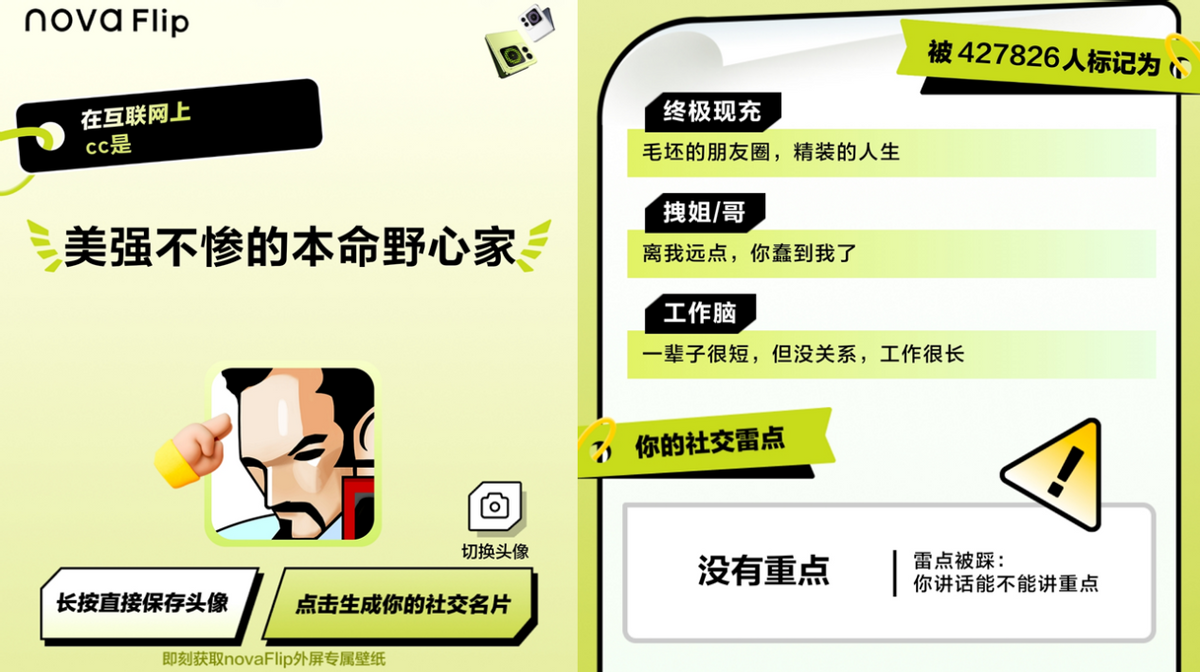 据悉,这次华为nova Flip与 QQ联手打造的潮流社交名片,可以让网友通过社交性格测试,全面呈现出个人社交标签和社交雷点,不仅能清晰地认识自我,也能更加轻松地筛选和结识那些与自己心灵相通、志趣相投的好友,以便在社交领域中找到那份难能可贵的认同感和归属感,让每一次的社交互动都充满意义。