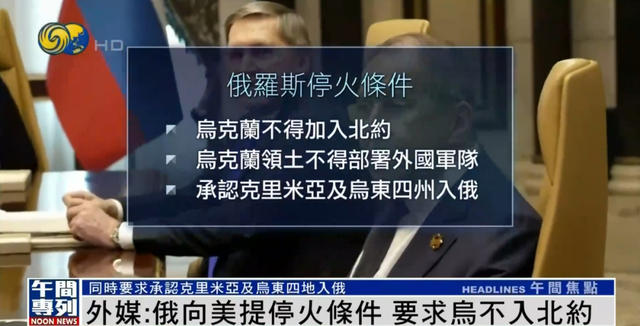 路透社引述消息人士报道,俄罗斯向美国提出的停火条件,核心诉求与其之前向美国、北约以及乌克兰提出的相似,即要求乌克兰不得加入北约、不得在乌克兰领土部署外国军队,以及承认俄罗斯对克里米亚及乌东四州拥有主权。另外,俄方可能还会强调解决“俄乌冲突的根源”,即美国为首的北约不断东扩。