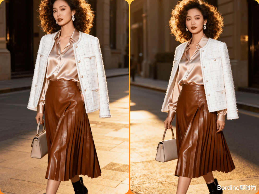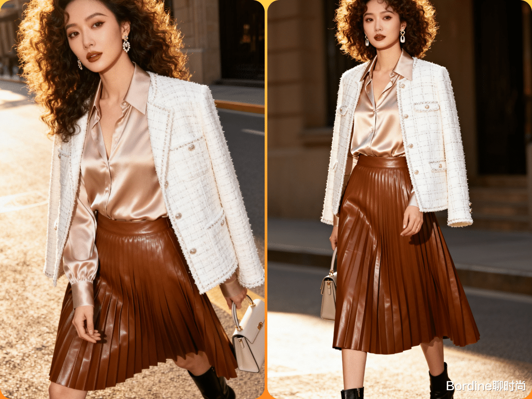 这样的衬衫和皮裙的搭配在秋冬的季节,还可以选择一款小香风外套进行搭配,以小香风的高级奢华感,为造型带来一些华丽时尚。