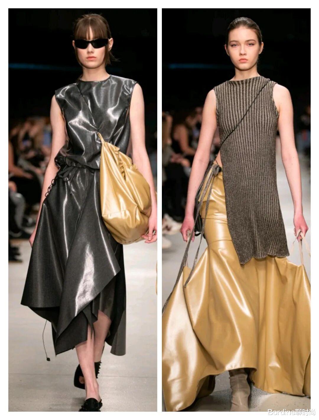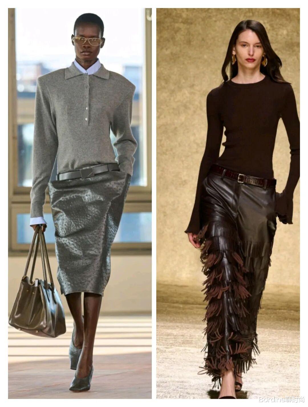 在皮裙上,这些夸张廓形的随性褶皱、流苏纹理等这些设计的出现,则让皮裙在质感中,增加了不少设计感的潮范儿。
