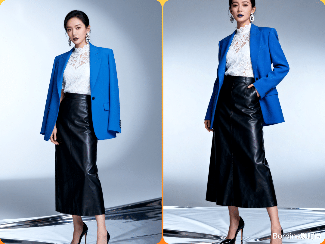 在这样的搭配中,不同的材质之间的碰撞创造出了更为丰富的视觉层次,在蕾丝和丝绸的柔美与皮裙的硬朗之间形成了鲜明的对比,凸显了女性魅力。