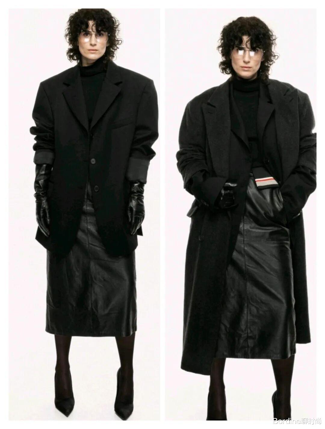 以全黑色颜色进行搭配,大面积的黑色颜色在沉稳的厚重感中,气质更为稳重大方,休闲的高领上衣和皮裙,还可以搭配一件同色的机车风夹克,酷飒气息更为浓厚。