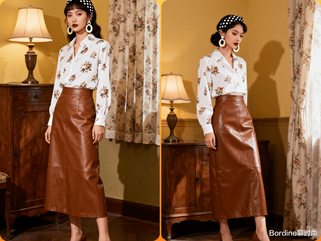 对于这种复古风的穿搭,在选择皮裙的时候,以简约为主,最简单的款式就可以穿出更多的氛围气质感;当然还可以选择一些自带着一些复古风情的皮裙。
