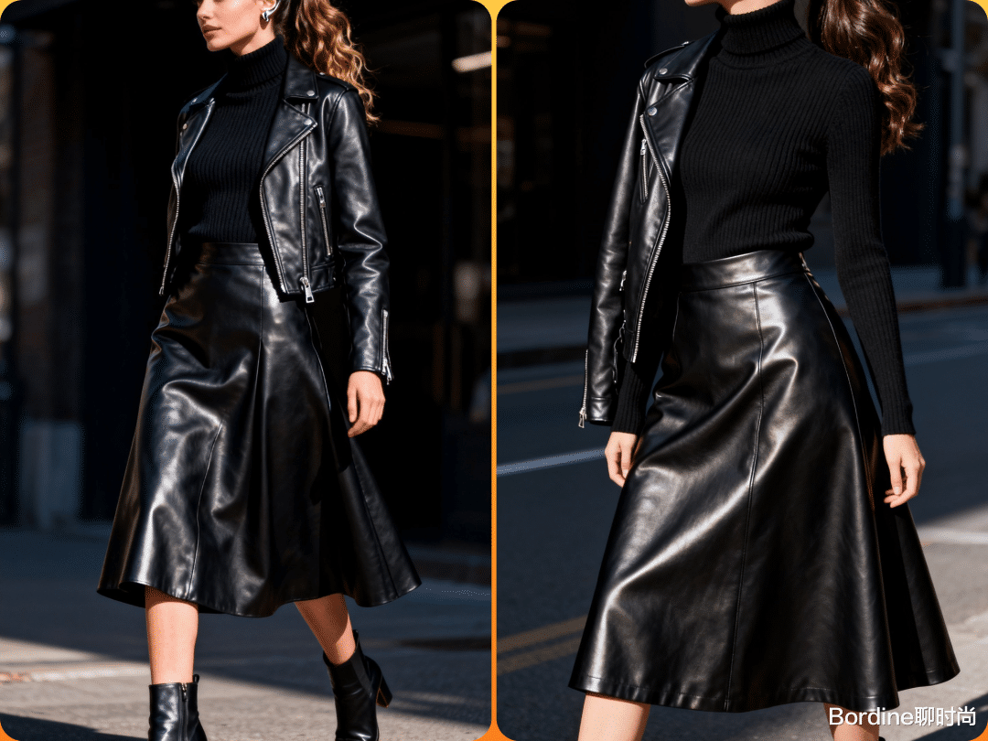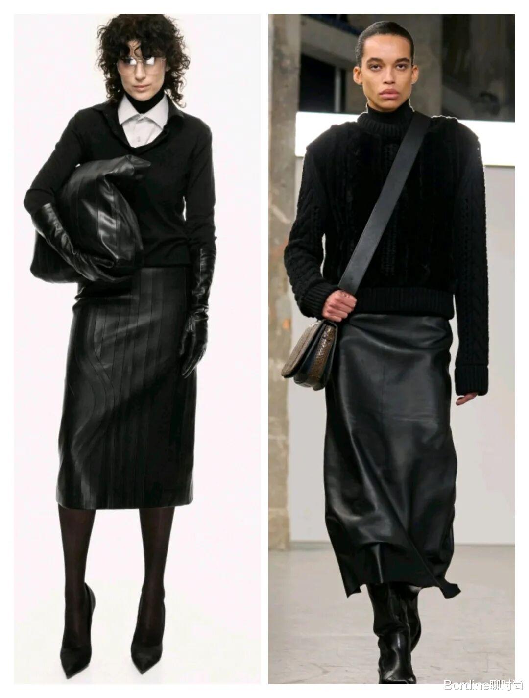 黑色皮裙的选择可以在A字的廓形中,结合一些拼接的线条、不对称的线条、口袋装饰等,以细节装点更多的时尚亮点。