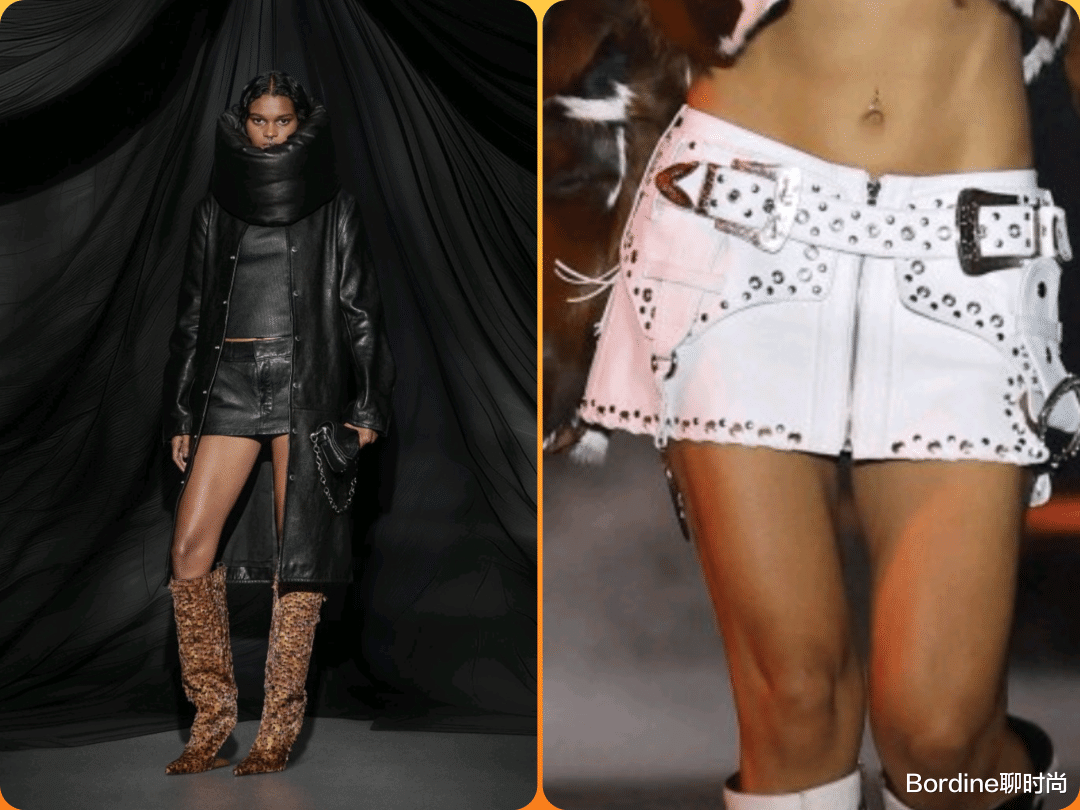 短款的迷你裙以皮革材质的出现,还可以结合一些铆钉、气眼、拉链等金属元素,让这些短裙也有着更多的细节酷感。