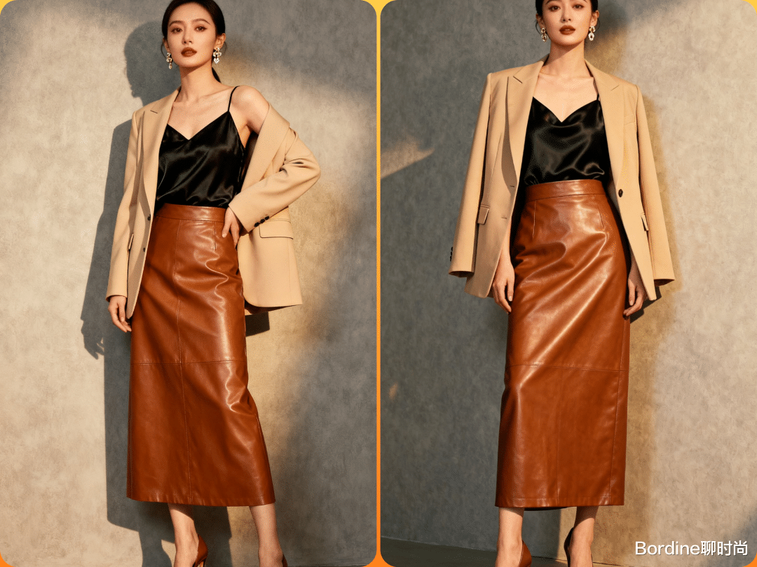 皮裙以同色颜色进行搭配,看起来整体感很强,不过材质的差异还是形成了一些对比,让气质更为丰富一些。