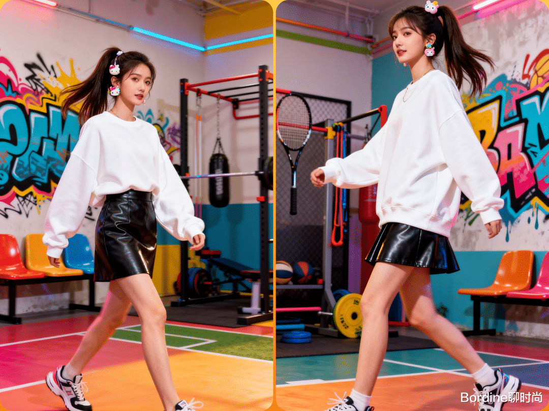 3.休闲街头风:皮裙+卫衣or毛衣以oversized廓形的卫衣或者是宽松的毛衣作为上衣,和皮裙进行搭配,在视觉上打造了“上宽下窄”的效果。