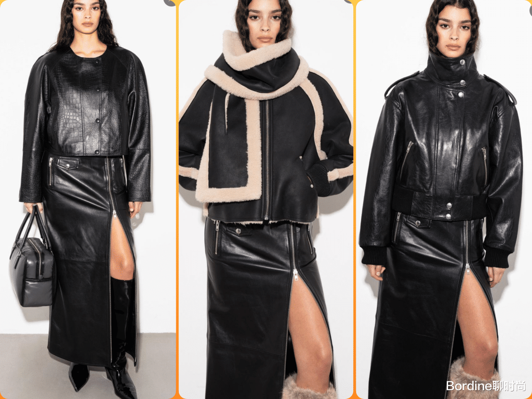 开叉裙与金属拉链进行结合,产生了一些开叉的高度我们自己可以决定的设计,在金属与皮革相互碰撞打造的酷飒中,不同高度的开叉也会呈现不一样的风格气质。