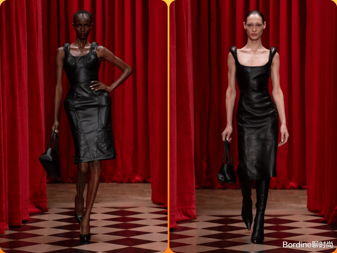 皮革连衣裙结合特色的领口、落肩的休闲等设计,让服装在宽松廓形的休闲中,时尚细节也多了不少优雅的潮范儿。