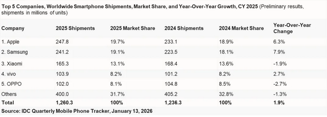 2025年全球前五大手机厂商出货量及市场份额情况 图源 / IDC