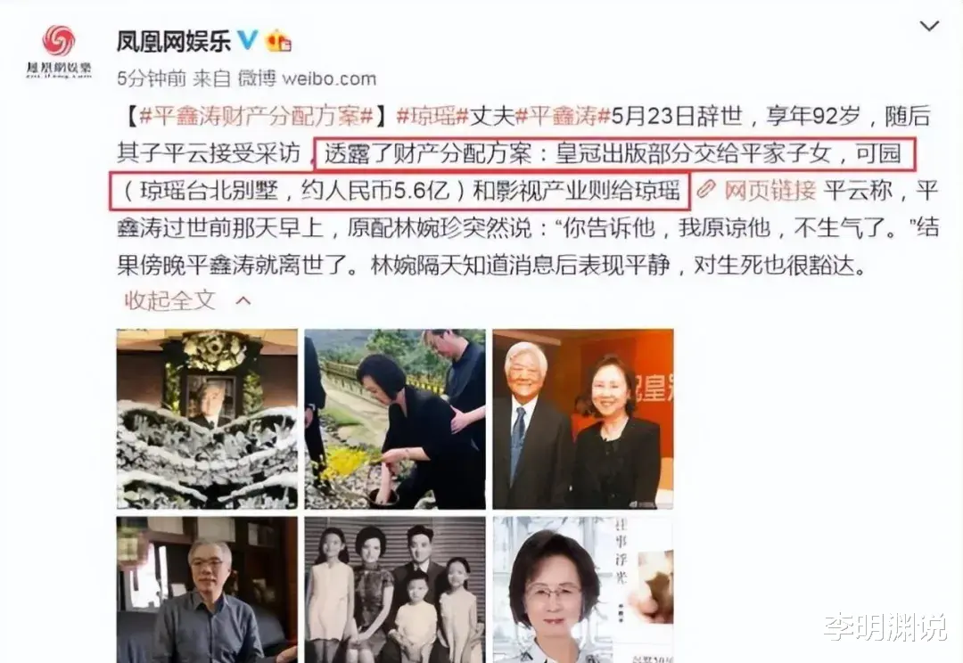 遗嘱里写着:皇冠出版社给平家子女,可园和影视产业给琼瑶。表面上看很公平,实际上这份遗嘱藏着刀子。