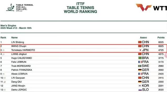 林诗栋坐着男单头把交椅笑得欢,8325积分让王楚钦追得直喘气。别看小王在重庆赛4-1干翻林诗栋夺冠,可因为去年积分被砍,反而和榜首差距拉开到1400分。