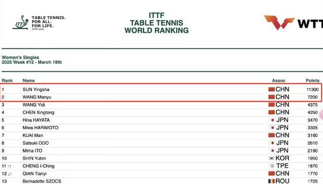 世界排名更新:国乒名将滑落前三,莎头被反超,孙颖莎断层领先