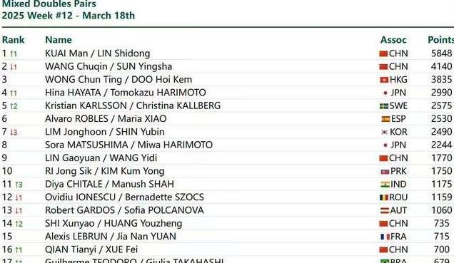 “莎头组合”115周的王座说没就没!林诗栋/蒯曼这对00后直接空降榜首,5848积分把师兄师姐挤到第二。这俩小将新加坡、重庆赛见一次赢一次,摆明了是冲着洛杉矶奥运去的。王楚钦/孙颖莎现在倒成了“回忆杀”,自从巴黎奥运后就没正经搭档过混双。球迷们也别急着哭,国家队这招“以老带新”玩得溜——莎头专注单打冲金,让小年轻去混双赛场练级,这算盘打得隔壁日本队都听见了!