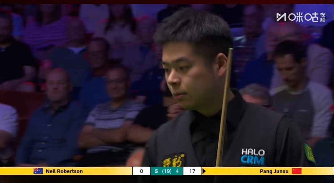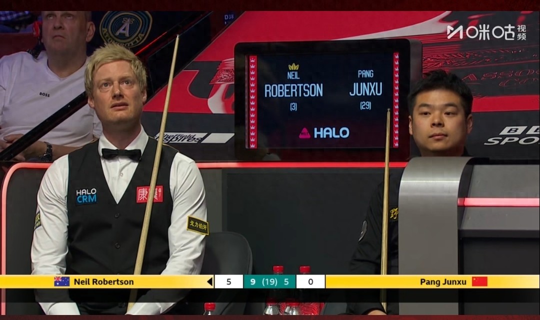 4月24日斯诺克世锦赛正赛第一轮,罗伯逊9-5领先庞俊旭拿到赛点,庞俊旭5-5之后连丢4局,罗伯逊距离16强越来越近了,庞俊旭基本上已经大势已去 ,出局已经是板上钉钉的事情!