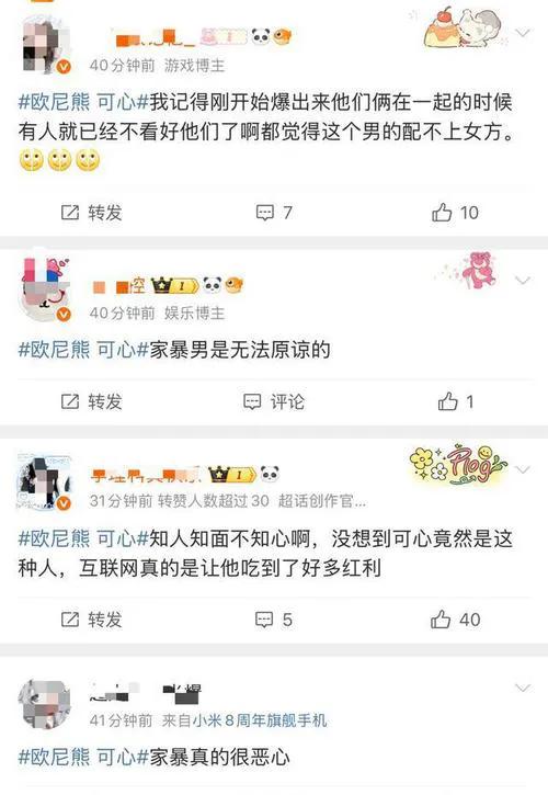 事件曝光后,迅速在网络上引发了轩然大波。网友们纷纷在评论区发表自己的看法,有人愤怒地指责可心的行为,认为他作为一个公众人物,做出这样的事情实在是太不应该。“真是知人知面不知心,没想到可心是这样的人,以后再也不看他的视频了!”“家暴和劈腿,这种人就应该受到法律的制裁和道德的谴责!”也有人对欧尼熊表示同情和支持,鼓励她勇敢地站出来,维护自己的权益。“欧尼熊,不要怕,我们相信你!一定要让可心为他的所作所为付出代价!”“女孩子在感情中一定要保护好自己,遇到这种渣男,一定要及时止损。”