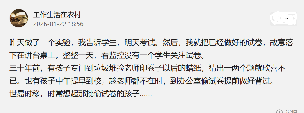 这两天,各地中小学进入期末考试周,家长群里的空气都凝固了。就在这个当口,一位老师发布的一篇短图文在网上疯传。