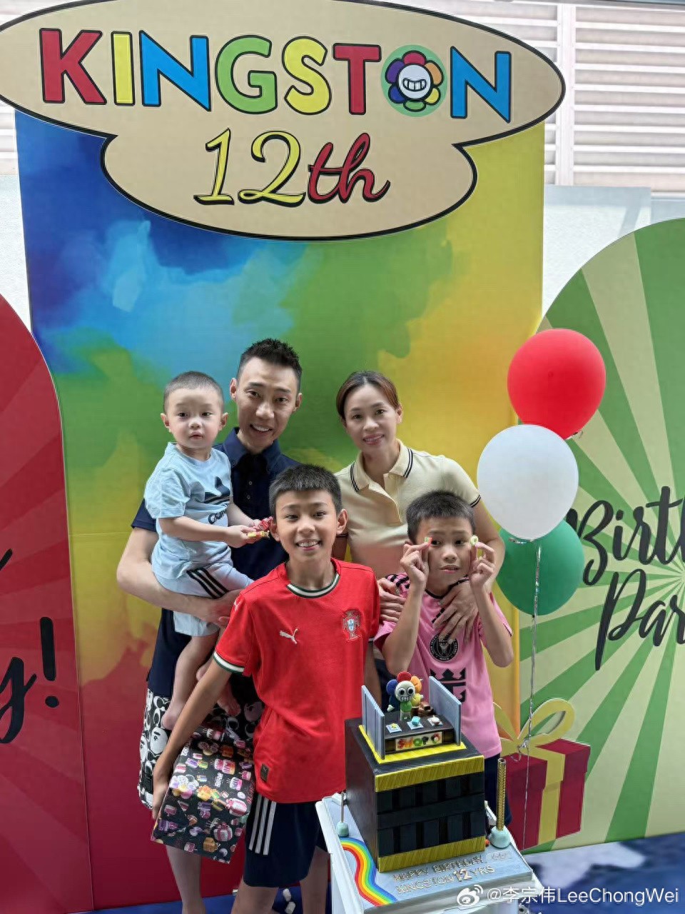 4月12日,马来西亚羽毛球名将李宗伟在社交平台晒出一家五口的温馨合影,为大儿子Kingston庆祝12岁生日。