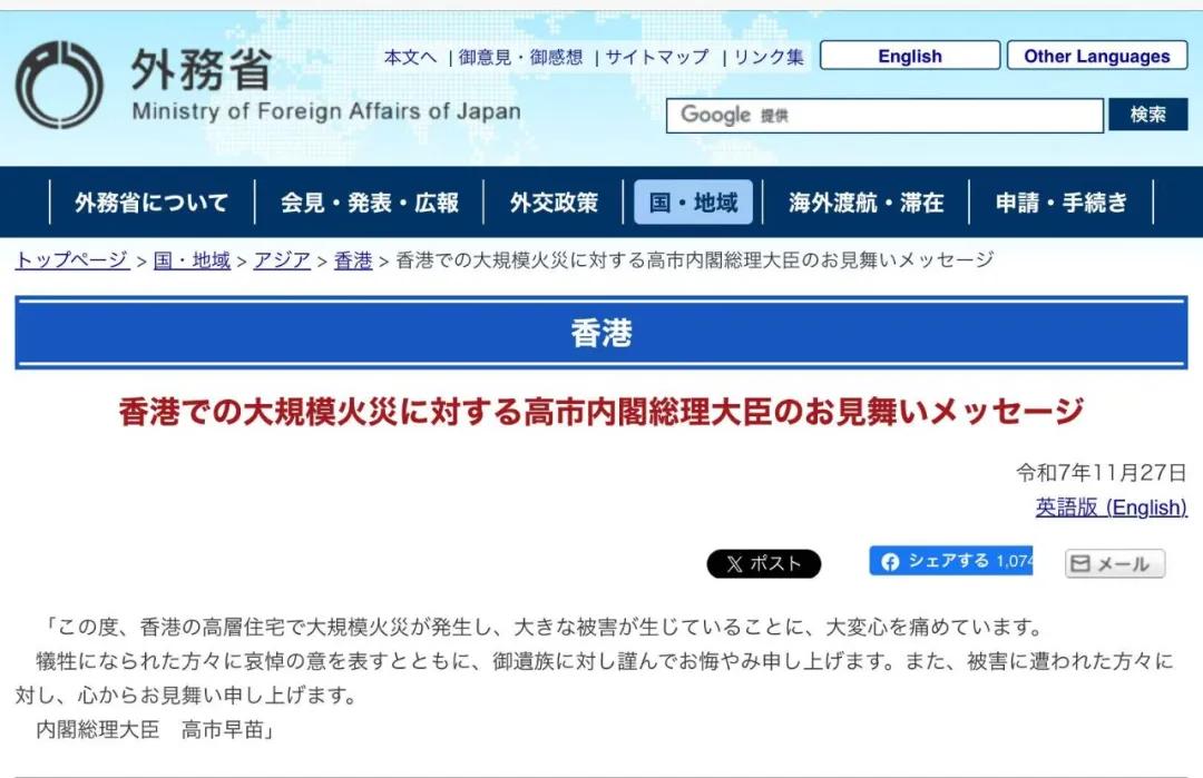 T先生:香港火灾发生后,高市早苗有表达过慰问吗?