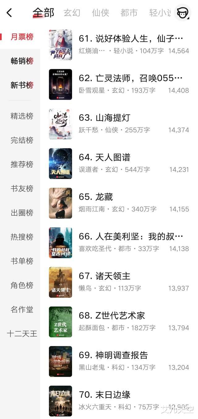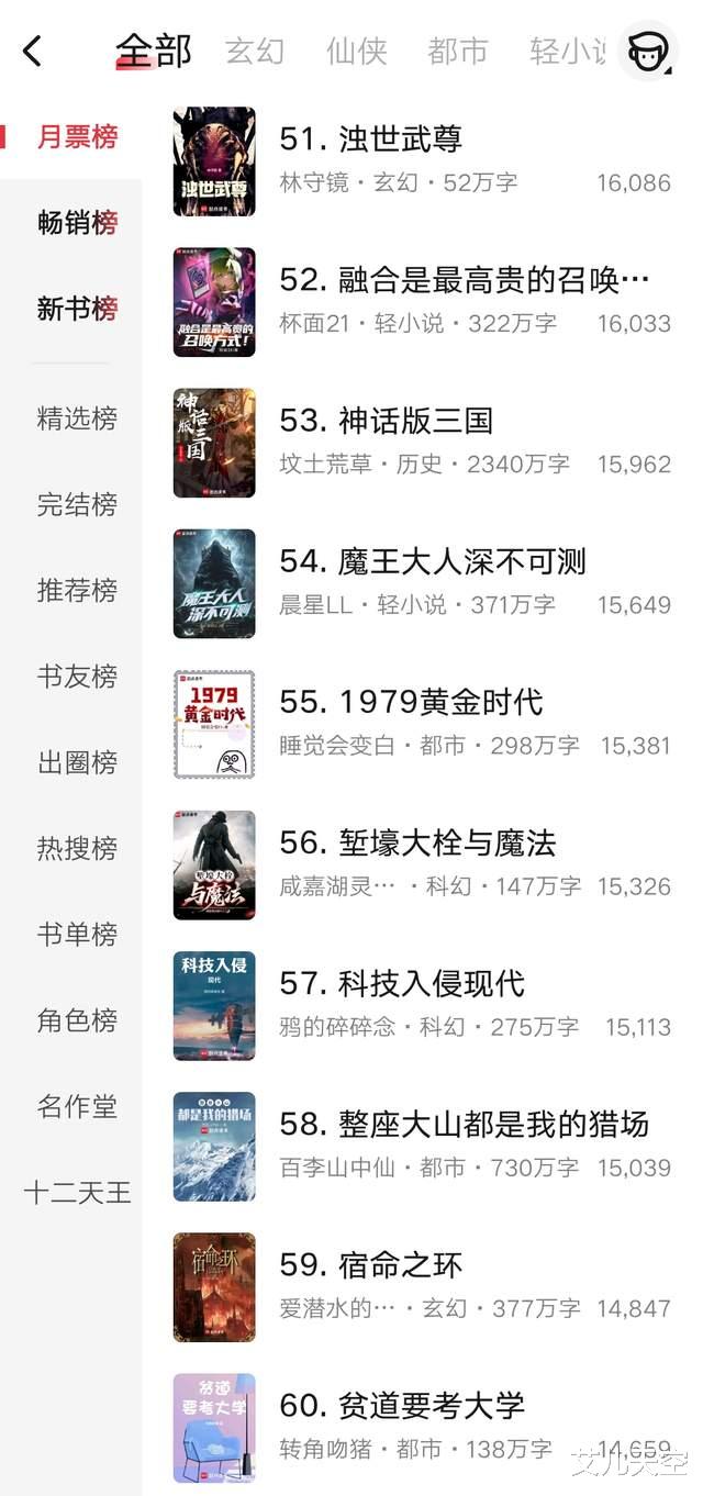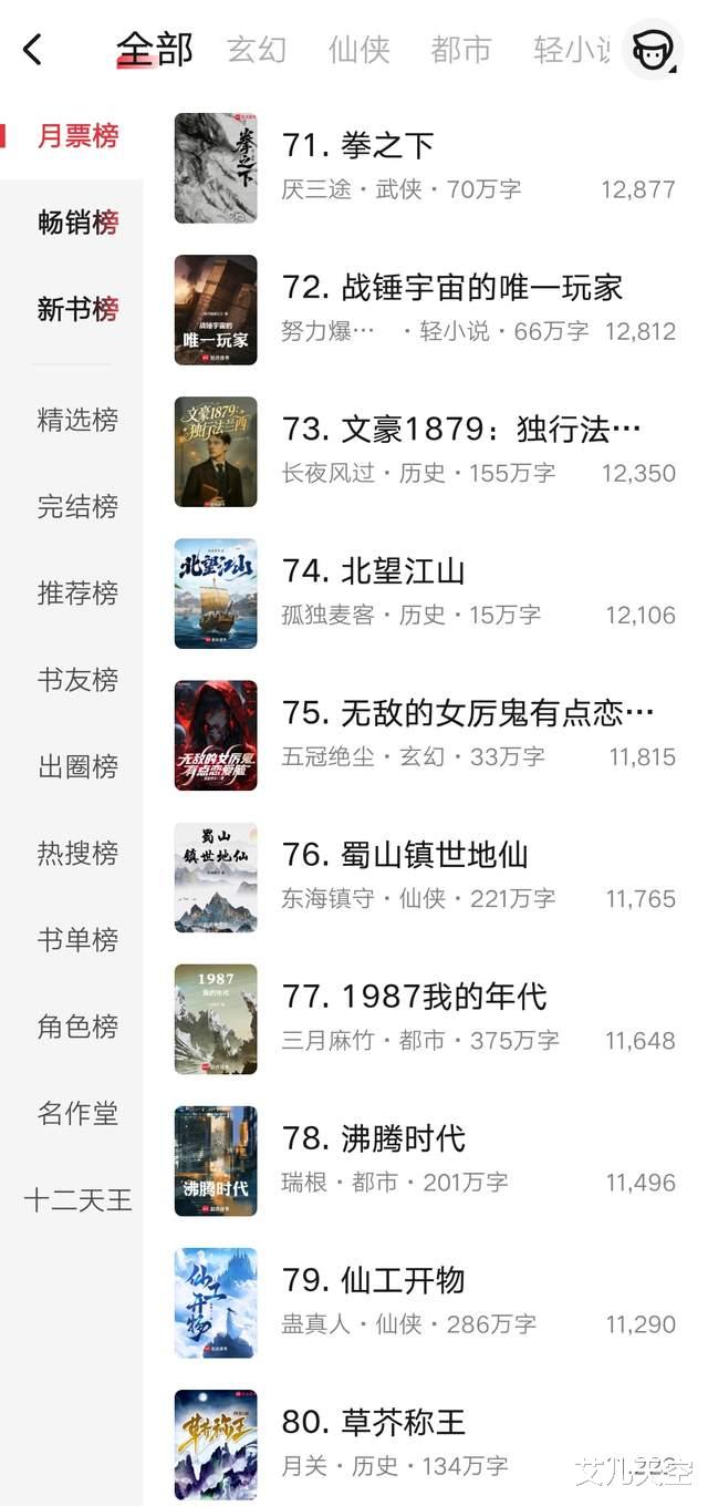 与之对应,拳之下、战锤宇宙的唯一玩家、文豪1879这三本就从前七十被挤到71、72、73了。