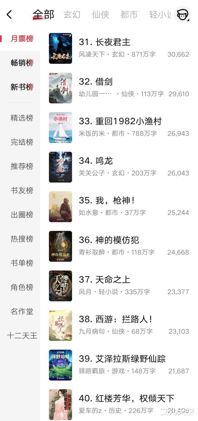 与之相对,风凌天下的《长夜君主》、幼儿园一把手的《借剑》被挤出了前三十,分别落在了第31、32名。