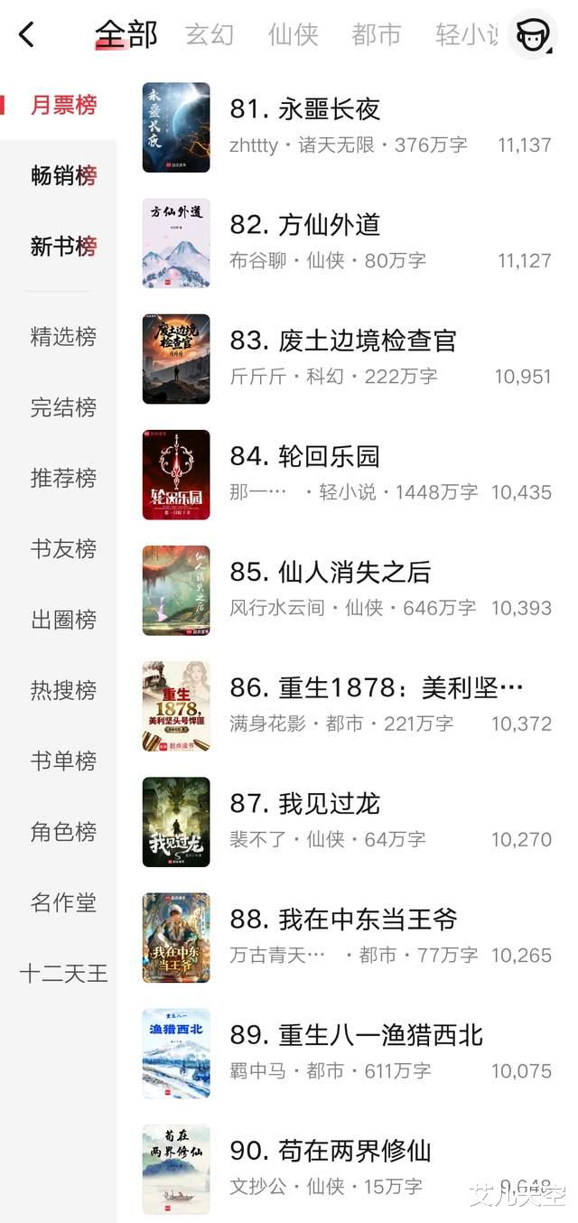 布谷聊的《方外仙道》、万古青天一株柳的《我在中东当王爷》则是被挤出前八十了。