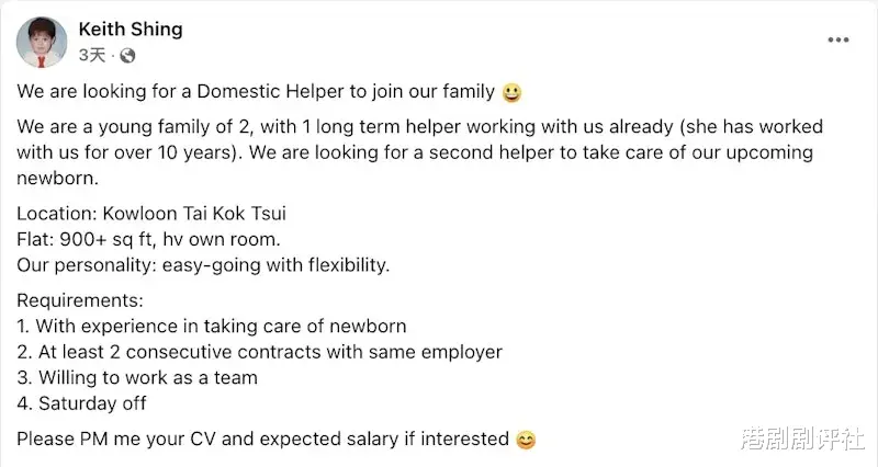 盛劲为还详细列出了对应征者的要求,透露他们家已有一位外佣,此次想再聘请一位,主要负责照顾即将出世的宝宝。应征者将拥有自己的房间,且逢星期六放假。