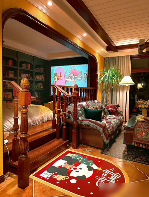 深棕家具配暖橙墙,绿植往角落一摆,童话感愣是揉进了烟火气里。