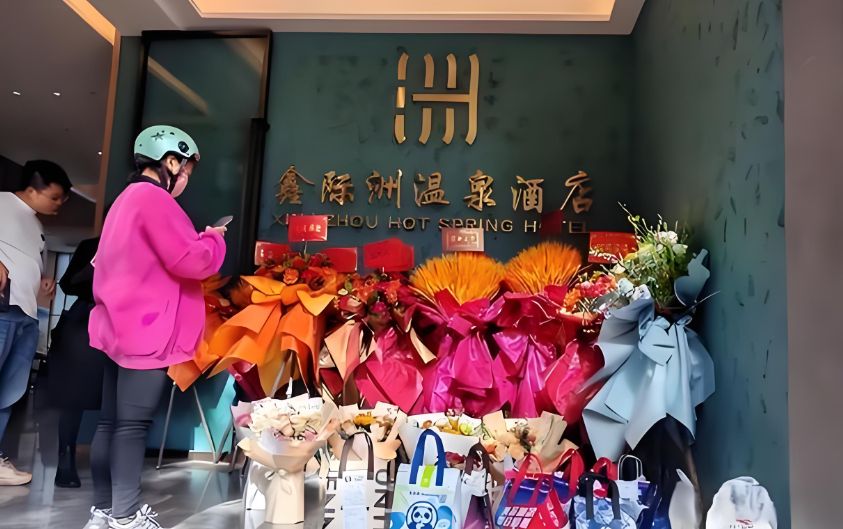 酒店大堂里、门厅两侧和酒店门前两侧的人行道上,现在摆满了全国网友通过服务平台赠送的鲜花、奶茶甚至鸡腿。都是表达犒劳前台两位小姐姐和祝福酒店生意兴隆的心意。