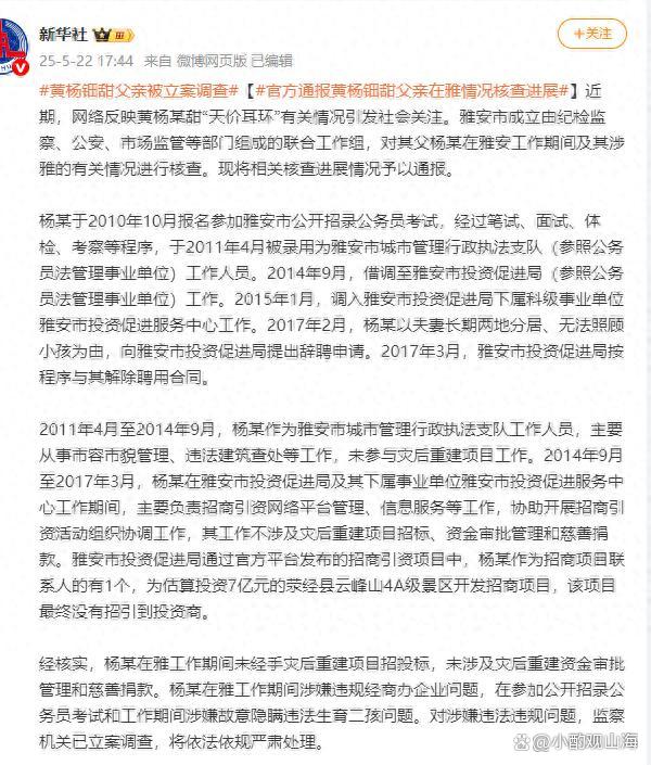 近日,一则关于网络红人黄杨某甜佩戴"天价耳环"的消息引发社会热议,其父杨某的公务员身份和过往经历被推上风口浪尖。最新消息显示,雅安市监察机关已对杨某涉嫌违规经商、隐瞒违法生育二孩问题立案调查,事件背后真相正逐渐浮出水面。