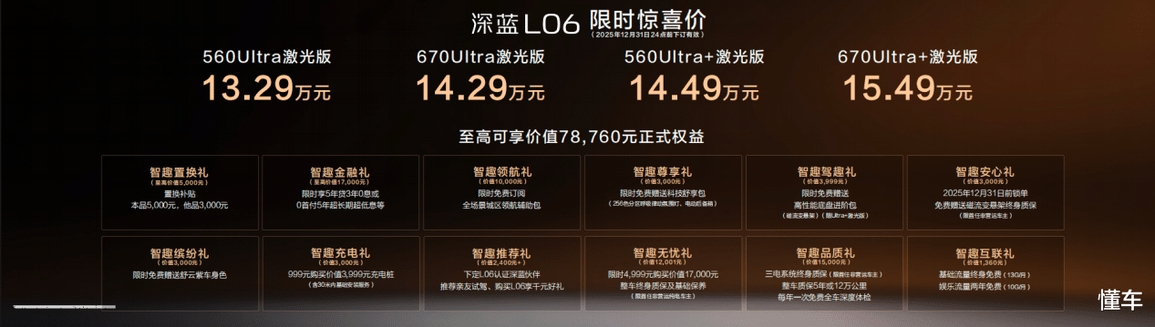 2025年11月18日,“长续航磁流变激光智能轿跑”深蓝L06价格及权益发布。新车共推出四款配置车型,售价13.29万元起,同时推出至高价值78760元的购车权益,并承诺将为11月30日前锁单,且非客户原因导致跨年交付的用户兜底全部购置税,以极具诚意的姿态登陆15万级纯电市场。
