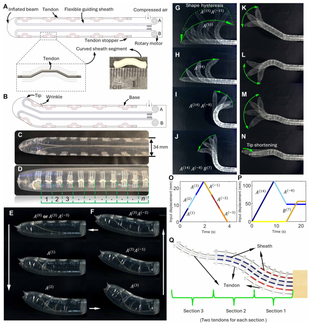 Figure 1:工作原理和原型。(A)由倒置之字形TSM驱动的充气连续梁具有沿着其内壁间隔地串联连接的弯曲鞘段。每个肌腱从电机通过引导鞘到尖端,然后通过弯曲鞘段倒置到基部。(B)电机拉动肌腱,导致充气梁从尖端到基部顺序弯曲,一段一段地。(C和D)机器人原型。(E)从尖端到基部顺序弯曲,间隙一个接一个地闭合(见影片S1)。(F)从尖端到基部的顺序伸直,间隙一个接一个地打开。(G)在加载和卸载阶段期间的不同路径,用于运动的输入命令被定义为A(n)和B(n),其中正n表示从尖端闭合n个段(肌腱拉力)和负n意味着打开它们(肌腱释放)。(H到J)机器人通过两个电机的顺序驱动转变为S形。(K到M)机器人可以在尖端转向而其余身体不受影响的情况。(N)拉动两个肌腱使机器人从尖端缩短,用于姿势调整。(G)~(N)的动作请参照影片S2。(O)与(E)、(F)的情况对应的输入位移。(P)输入位移对应于(I)和(J)中的情况(模拟)。(Q)由六个腱驱动的传统三节连续体机器人,每个节由两个腱独立驱动。更灵活的需要更多的致动器,增加了系统的复杂性。