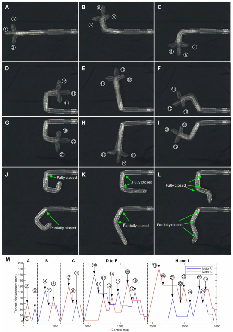 传统上,两个电机只能控制一根腱,产生三种状态(拉、放、停)。但这个设计里,两个电机控制n段,可以产生3ⁿ种形状。这背后的机制是:顺序弯曲+迟滞,让同一个输入序列在不同时间产生不同结果。