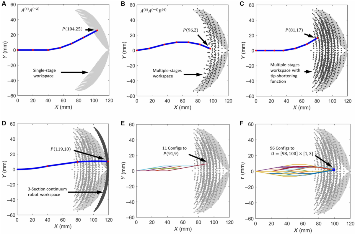 Figure 4:六节HasMorph机器人的运动工作空间扩展和各种不同构型的比较。(A)单弯曲阶段,即单肌腱拉/放循环实现的工作空间。(B)多弯曲阶段(多个拉/放循环)合并时的扩展工作空间。(C)通过允许一个截面的两个护套间隙闭合,即截面是直的,但其长度从S + G缩短到S,进一步扩大了工作空间。(D)所提出的机器人工作空间的比较(需要两个肌腱)与传统的三节肌腱驱动连续体机器人(需要六根钢筋束),突出了所提出的机器人的上级覆盖由于其多级顺序弯曲和缩短机制。使用缩短和多级弯曲策略的组合,机器人以11种不同的配置到达相同的目标位置。(F)机器人有96种不同的配置到达蓝色正方形区域Ω。