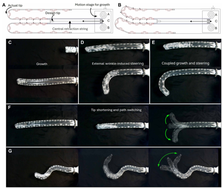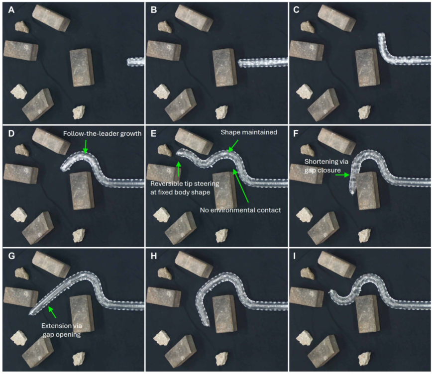 他们把这个机制集成到了一种特殊的生长型机器人中,让它能在复杂环境中生长、转向、缩短,甚至像“跟随领头者”一样在障碍物中穿行。