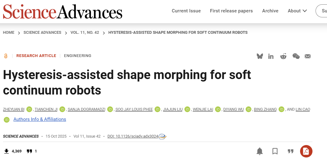 引文格式:Bi Z, Ji T, Dogramadzi S, et al. Hysteresis-assisted shape morphing for soft continuum robots[J]. Science Advances, 2025, 11: eadx3024.
